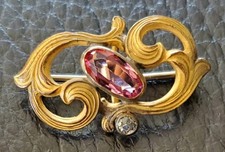 Antique Victorian Pink Paste Stone Brooch Gold Tone Scroll Design c1900