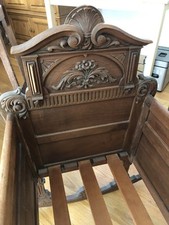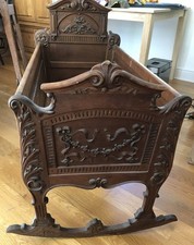 Exact age is unknown. We were told it was Spanish, but its provenance is unknown. We bought it years before we had our own baby. Our baby, however, didn’t seem to like it. The rocking motion was a bit choppy and always woke her up.