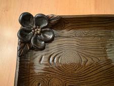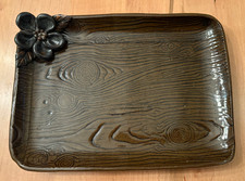 This is a nice cabin or rustic decor rectangular dish that could be used for all kinds of things (towel or soap holder for the bathroom, trinket dish, hors d'oeuvres tray, etc). It is ceramic with a wood grain applied finish and a flower accent in the upper corner. Measures 10 inches long by 7.25 inches wide. Handmade by Katie and signed on the back. From a smoke free home. Thank you for looking and bidding!