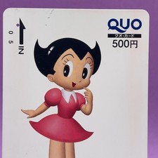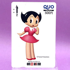 Rare Quo card featuring Uran from Astro Boy, issued for the Asahi Shimbun "Challenger" campaign. Type: Quo Card / Value: 500 JPY / Issuer: Asahi Shimbun / Studio: Tezuka Productions. Cards, tickets, stickers: protected with cardboard and sealed in sleeves.