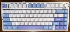 The AULA F75 75% Wireless Mechanical Keyboard in white, blue, and purple is a sophisticated and classic product designed for unisex use. It features a QWERTY keyboard layout, illuminated keys, and is powered by battery with USB-C connectivity. The keyboard is compatible with the EPOMAKER brand and has a standard form factor. With its stylish shade of light blue and premium material, the AULA F75 keyboard offers a high-quality typing experience for users looking for a sleek and efficient device.