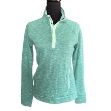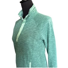 Avalanche green 1/4 snap, high neck athletic pullover; women's size medium. Excellent preloved condition. Features high neck, two-tone green soft knit fabric, long sleeves with thumb holes at the ends, and two slash pockets on lower front. Approximate measurements: P2P - 18" Length - 25" athletic, athleisure, loungewear, performance, workout, running, casual, everyday, weekend, quality, heritage, colorful, gorp, gorpcore