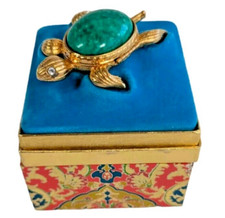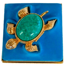This Avon perfume holder is a must-have for any collector or lover of vintage vanity items. The gold tone sea turtle design is beautifully crafted with a mottled green back and solid construction. It is empty, making it the perfect display piece for your favorite perfume or other small items. The compact size and lightweight design make it easy to carry with you on the go. Add this unique piece to your collection today! Condition is Pre-owned. Please Refer to Pictures for Condition Details and Measurements. Shipped for Free.