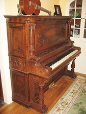 Circa 1899 B. Shoninger in a Louis XIV Burl Walnut cabinet. This is one of the rarest of all antique upright cabinet grands. It has been converted to digital pneumatic allowing you to play millions of songs on this piano from the internet from any PC.
