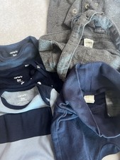 The product is a baby boy clothing bundle consisting of a 5-piece set in navy blue and grey colors. The set includes items from brands like Carters and H&M, designed specifically for boys aged 3 months. The variety of colors in the set makes it versatile for different outfits and occasions, ensuring your little one looks stylish and comfortable. Perfect for parents looking to expand their baby boy's wardrobe with high-quality and trendy clothing pieces. **preloved and sold as is***