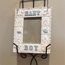 This baby boy picture frame features a white and blue quilted decorative design, making it a charming addition to any nursery decor. Specifically designed for boys, this frame is perfect for displaying precious memories and baby announcements. Its stylish design will complement any baby's room, making it a unique and sentimental way to showcase your little one's milestones. Used, good condition. There is some glue residue inside the frame-not visible from the outside.
