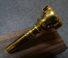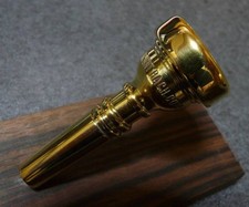 This is a rare Bach 5CFL mouthpiece featuring a short shank design, making it a unique find for trumpet players seeking distinctive sound and playability. It is 99% gold plated, showcasing a brilliant finish with no significant scratches, reflecting its excellent condition.