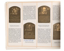 The autographs are executed inblue and black ballpoint or fiber-tip pen, with the majority signed directly below each player’s plaque image. Notable examples includeSatchel Paige ,Stan Musial ,Ernie Banks ,Bob Feller ,Charlie Gehringer ,Cool Papa Bell, andMonte Irvin, among others.