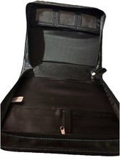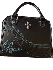 Black faux leather Bible case w/ all around zipper, spacious inside with zippered pocket and card holders. Made by Guardian Angelz ( Bridgeport Products) This has a silver cross and features embossed verse in teal “Seek God's will in all that you do and he will direct your path." Proverbs 3:5-6: " This is a lovely way to carry your bible and other necessities. It measures 9”x 10.5” x 2.25” and 20” when completely open. This is in good condition, but does show two tiny snags on bottom of bag, and by buckle, pictures are there. I’m pricing accordingly ! This is sold in as is condition.