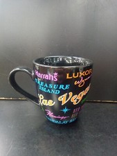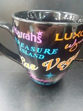 This black Las Vegas Hotels mug is the perfect addition to any casino memorabilia collection. Featuring the iconic Las Vegas hotel names, this mug is a must-have for any fan of the city's iconic culture. Some worn graphics.
