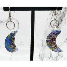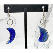Each crescent hangs from silver tone wire hooks with a small connector ring. • Crescent moon shaped glass dangles. • Crescent glass: approx. These unique earrings add a touch of celestial style and artisan glass beauty to any outfit.