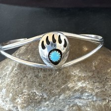 Blue Turquoise Navajo Sterling Silver Shadow Box Bear Paw Cuff Bracelet 19290