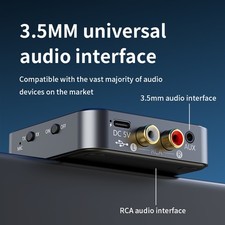 Product interface:RCA audio, AUX audio. 1x AUX Audio Cable. It can also wirelessly transmit audio sources to Bluetooth-compatible headphones/speakers and other devices. 1x RCA Cable. 1x USB Data Cable.