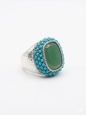 Boho Turquoise Beaded Statement Ring Green Cushion Stone Dome Bombe Design