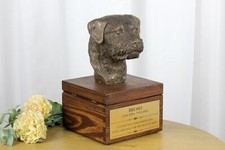 The wooden urn, made from pine wood, has an elegant closure and a gold plate with black engraving. An important aspect is personalization - provide us with your pet's name, date of birth and death, and a selected quote, and we will engrave them to make this urn unique. The bottom of the urn has felt rings to prevent scratches on furniture when moving. The main element of the urn is a beautifully crafted bronze statue of a dog, made using the cold casting process. This material combination stands for durability and timeless beauty. Please be very careful when opening the urn - the statue attached to the lid is heavier than the box. Hold them firmly to avoid falling and damage. Material of the statue: The statues are made of bronze using the cold casting process. This uses a mixture of bronz.