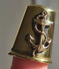 Brass plated thimble with Anchor. Tiny bit of wear to brass plate. Please see photos. 2.3cm tall.