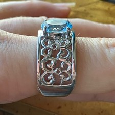 This gorgeous ring is made with real, earth mined blue topaz from Brazil. The stone measures 10x8mm and is a total carat weight of 2.82. The ring is set in solid .925 sterling silver with a rhodium plate to prevent tarnishing. The ring in the photos is the actual one you will receive, so please see photos for quality and measurements. The gemstone is tested in photos for verification. Size 9. Inventory: J4
