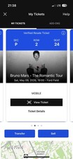 Bruno Mars - The Romantic Tour | May 9, 2026 | Ford Field, Detroit, Michigan • Section P, Row 2, Seats 23-24 • 2 tickets, $476 each (all or nothing) • Electronic ticket transfer through Ticketmaster Please message me on Facebook (Euben Hope) for questions 🙂