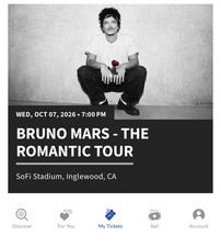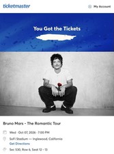 Selling 2 tickets for Bruno Mars at SoFi Stadium on October 7, 2026. $300 each Section 530, Row 6, Seats 12–13. Seats are right next to each other. These are mobile tickets bought directly from Ticketmaster. I can show proof of purchase if needed. Tickets will be transferred to you through Ticketmaster right after payment. No physical tickets — this is an electronic transfer.