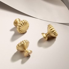 Specific Uses For Product: Cabinets, Drawer, Wardrobe. Color: Brushed Gold. ELEGANT DESIGN: The design of shape is inspired by the pumpkin. Color: Brushed Gold. PREMIUM MATERIAL: The brushed gold cabinet hardware handles is made of premium solid brass.
