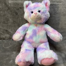 This Build-A-Bear plush is a 16-inch cat in pastel tie-dye colors of pink, purple, aqua, and white. The cat has purple eyes and comes with a tie accessory. The plush is made of soft material and is recommended for ages 3 and up. This cute and colorful kitty is perfect for all occasions and would make a great addition to any stuffed animal collection.