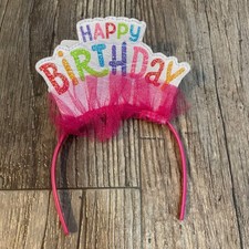 Build-A-Bear Workshop birthday celebration outfit set features a vibrant pink 'Happy Birthday' graphic t-shirt and a coordinating pink knit sweater with shimmering white sequin stripes. The set includes a festive pink headband topped with a glittery 'Happy Birthday' tiara and a pair of iridescent metallic rainbow sandals with wood-grain patterned soles. Both the t-shirt and headband are brand new with original tags attached, making this a perfect gift for any plush friend's special day.