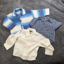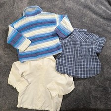 Bundle of 3 vintage baby boy 3T shirts /tops: 1. handknit blue and white striped sweater in excellent condition, never used. Adorable! Note the hole from a knitting mistake (see pic, not obvious when worn) 2. blue checkered shirt sleeve button up shirt in excellent condition 3. vintage long sleeve white shirt (brand:Okie dokie) with flaws (1 small stain near the hem and 3 very tiny holes that aren't very noticeable, see pics) #babyboy #thanksgiving #holiday #party #handmade