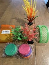The bundle of hermit crab supplies/accessories includes a variety of items for pet hermit crabs. Colorful plastic plants, a bridge, and some disc-like things that I’m not sure of their purpose as I’ve never owned a hermit crab. These accessories came with a tank I purchased. Sold as is