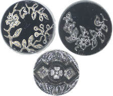 This set includes three antique Victorian-era buttons from the 1890s. Each button features a unique floral design in black glass with silver luster accents. Item is sold "as is".