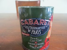 Embossed tin can with beautiful lady Cabaret in Paris, and Eiffel Tower on can. LES MISTINGGUETTES. FRENCH CAN CAN. No matter how big or small your item is.