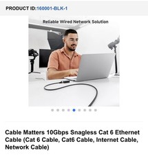 • Snagless RJ45 connectors for durability. • Compatible with Cat5, Cat5e, Cat6 networks. Cable Type: Cat6 Ethernet. 1 × Cable Matters Cat6 Ethernet Cable. Connector Type: RJ45 Male to RJ45 Male. • 24AWG copper conductors for improved signal quality.