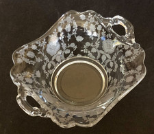 Cambridge Roselyn Etched Glass Dish 2 Handles Flower Trinket Candy Mid Century