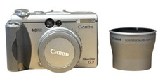 Included is a Canon Conversion Lens Adapter LA-DC58B and Canon Lens Cap. The screen appears to be in very good condition. The lens appears to be in good condition.