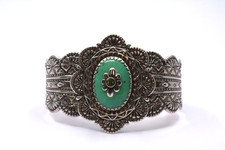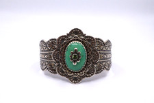 The Carolyn Pollack 925 Sterling Turquoise and Peridot Cuff Bracelet is a stunning piece of jewelry. Made with high-quality 925 sterling silver, with a total weight of 74.2 grams. This bracelet features a beautiful oval turquoise at center with a round peridot stone accent and ornate detailing throughout.