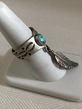 This Vintage Carolyn Pollack Carlisle Signed With a Matt Sterling Silver Finish Turquoise Feather Ring in size 8 is a stunning piece of jewelry that blends Native American style with elegant sterling silver craftsmanship. The main stone, turquoise, adds a vibrant pop of color to the design, making it a unique and eye-catching accessory for any outfit. The ring's intricate drop feather detail and signature branding from Carlisle further elevate its appeal, making it a standout piece for those who appreciate ethnic and tribal jewelry.