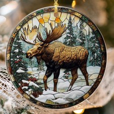 Featuring a beautifully detailed moose standing proudly in a serene winter forest, the design is crafted in a stained glass style that brings vibrant colors and intricate details to life. Its round shape and polished edges give it a refined finish, while the glossy glaze enhances every detail of the artwork.