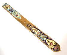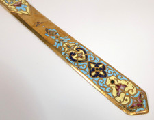 This magnificent letter opener from the French historicist period, made about 1860-1880, is an exquisite example of the high artistry of French enamel work. The floral and ornamental decor extends across the handle and parts of the blade and shows a harmonious palette of rich cobalt blue, light turquoise, white and dark wine red accents. The fine golden bars that separate the enamel fields form a delicate network of volutes, flower motifs and stylized leaf ornaments that reflect the typical taste of the Neo-Renaissance and Orientalism. Particularly noteworthy is the excellent condition of the enamel, which, despite its age, shows hardly any chips and has retained its original shine. The gilding of the metal base is slightly rubbed, which gives the letter opener an authentic, noble pati.