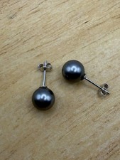Elegant and classic with a modern twist. These beautiful charcoal grey pearls have a high-luster finish and a perfectly round shape. • Size: 5.6 mm. • Color: Deep Charcoal Grey. • Backing: Secure butterfly push-backs. • Condition: Brand New.