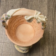 The Cherished Teddies Bear Basket Spring Figurine is a small, vintage resin figurine created by artist Priscilla Hillman in 1995. This adorable bear figurine features pastel colors of peach, cream, yellow, and purple, making it a perfect addition to any collection or as a special occasion gift. Featuring a charming design and a theme of spring, this licensed reproduction from the Cherished Teddies brand captures the essence of the 1990s with its detailed craftsmanship and timeless appeal.