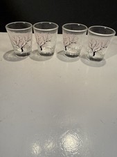 This product is a set of four clear shot glasses featuring a cherry blossom design. These shot glasses are perfect for collectors or for adding a decorative touch to a barware collection. Made of glassware, these shot glasses are ideal for serving shots of your favorite spirits in style. The elegant cherry blossom motif adds a touch of sophistication to any drinkware setup.
