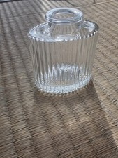 The product is a clear oval glass bottle with a ribbed design, measuring 3.5 inches in length. This modern bottle is perfect for collectors of unique and stylish glassware items. Its clear color adds a sleek and elegant touch to any collection, making it a standout piece for display.