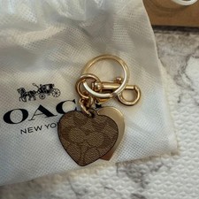 **Title:** COACH Heart Key Ring Signature Canvas **Description:** This is a COACH heart key ring made of signature canvas. I purchased it at a COACH outlet but have not used it. It has been stored away. The original box and dust bag are included. Please note that the box will be folded for shipping. The item is brand new and unused, as it was only taken out for photos. COACH keychain, gold charm.