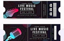 The image displays a stylized concert ticket design meant for a live music festival event. The ticket features vibrant graphics of a guitar and microphone, with a sleek black background and bold typography. It includes essential details such as the event name, date, and venue, making it suitable for promotional or graphic design use.
