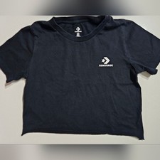 Converse black cropped t-shirt featuring the classic Star Chevron logo on the front. Soft and lightweight fabric, perfect for casual outfits, streetwear looks, or everyday wear. • Brand: Converse • Size: Small • Color: Black • Style: Cropped T-shirt / Crop top • Short sleeves • Crew neck • Front Converse logo 📏 Measurements (approx.) • Length: 16 in Condition: Pre-owned in good condition. No major flaws.