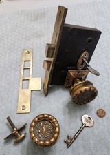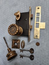 A non-reversible RIGHT hand mortise lock ( From the Flanders Hotel, Ocean City, NJ) that measures 3-1/2" x 5-1/4" high with the edge plate being 1-1/8" x 7-1/2 inches long. The locks didn't come with hardware so I have added some so people can use the locks. This lock was used for hotel rooms and office doors, it's a RIGHT Hand only with the hinges on the left, lock on the right pulling the door toward you. Some of the keys are marked. Please take a look at my other 200+ hardware items in my store, thank you.