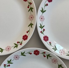 This is a set of three Corelle Vitrelle dinner plates in the Spring Pink pattern.