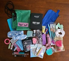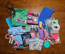 This cosmetic grab box includes: a drawstring bag and canvas bag to hold all items, wide tooth comb, a mini hairbrush, a compact mirror, 2x lip gloss, hand cream, and various makeup brushes, false lashes, complete nail set with all tools necessary, various makeup items, full-size nail polish, a full set of makeup in either pink or black, plus more.... A cosmetics lover's dream!