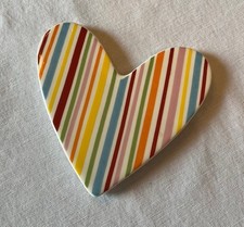 The Coton Colors Happy Everything Stripe Heart Attachment is a multicolor ceramic ornament manufactured in China in 2009. It features a striped design with a heart attachment, making it a versatile and charming addition to any holiday or seasonal decor. This collectible item from the brand Coton Colors is perfect for displaying at Valentine's or as a year-round accent piece in any room. Use the serving piece at your Galentine's party!