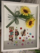 This Craft Framed Mixed Media Collage Art features a contemporary style with a family home theme, showcasing sunflowers in a small size. Handmade with a mix of paper, plastic, and fabric, this original piece is framed and exhibits a 3D effect. The collage art captures the essence of family, flowers, and home in a unique and artistic way, making it a perfect addition to any living space. 15 inches long 12 inches tall 2 inches wide (3D)