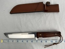 This is a well‑made custom fixed‑blade hunting knife with a polished drop‑point blade, hardwood handle, and two decorative mosaic pins. The blade is engraved with the Latin motto “ETIAM SI OMNES EGO NON”, meaning “Even if all [others], I will not.” The knife is solid, well‑balanced, and shows quality hand craftsmanship. The knife comes with a hand‑stitched leather sheath featuring a Western‑style bull‑rider concho on the retention strap. The sheath fits the knife securely and has a classic working‑knife look. Measurements • Overall length: approx. 12 inches • Blade: polished drop‑point • Handle: hardwood with mosaic pins and lanyard cord • Sheath: hand‑stitched leather with bull‑rider concho